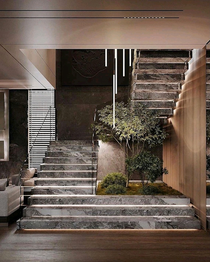 Thay vì vậy bạn có thể nghĩ đến việc trồng một cây xanh lớn ấn tượng ở trước sân hoặc ở khoảng giếng trời hay sân giữa của nhà. Nguyên tắc kiến trúc đương đại “The fewer the bigger” có lẽ sẽ còn tồn tại trong một thời gian rất lâu. Chỉ một điểm nhấn màu xanh duy nhất, nhưng đủ mạnh mẽ, đủ tỏa bóng sẽ khiến cả ngôi nhà bừng cảm giác thiên nhiên. Chưa kể công chăm bón mỗi ngày cũng bớt đi rất nhiều, giúp bạn tiết kiệm thời gian chăm sóc so với việc thiết kế rải rác các nhóm cây xanh khắp nhà.