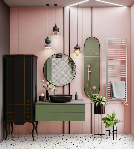 Không dừng lại ở một hai gam màu trung tính an toàn, phòng tắm của bạn giờ đây như một cuộc chơi sắc màu thú vị. Chẳng ngại dùng các tone màu nóng, tạo điểm nhấn với các màu sắc nổi bật, hầu như không có giới hạn, nguyên tắc nào cho phòng tắm theo trường phái này. Tuy nhiên cần lưu ý nghệ thuật phối màu và các quy luật họa tiết để đảm bảo các chi tiết khi kết hợp với nhau sẽ tạo nên thị giác lạ mắt, kỳ lạ mà vẫn đồng bộ, thanh lịch cho cả không gian.
