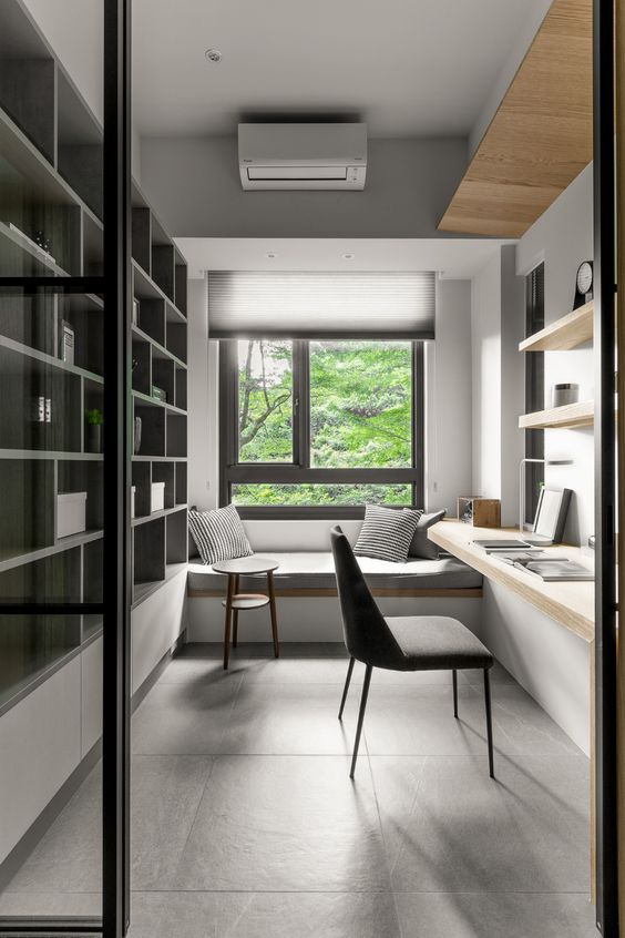 Đang setup một không gian làm việc tại nhà, vậy sao không để không khí gia đình yên bình tràn ngập góc làm việc. Thiết kế phòng làm việc có một khoảng cửa kính nhìn ra các góc sinh hoạt khác của gia đình, có một khoảng lùi nhỏ để chất thêm cây xanh, một góc nào đó của phòng có thể thông ra sân trong hoặc pantry hay bếp ăn, nhưng vẫn giữ được riêng tư nhờ lớp bình phong hoặc màn lửng. Phong cách phòng làm việc này hoàn toàn phù hợp với nhiều diện tích không gian khác nhau, kể cả các khu vực nhỏ.